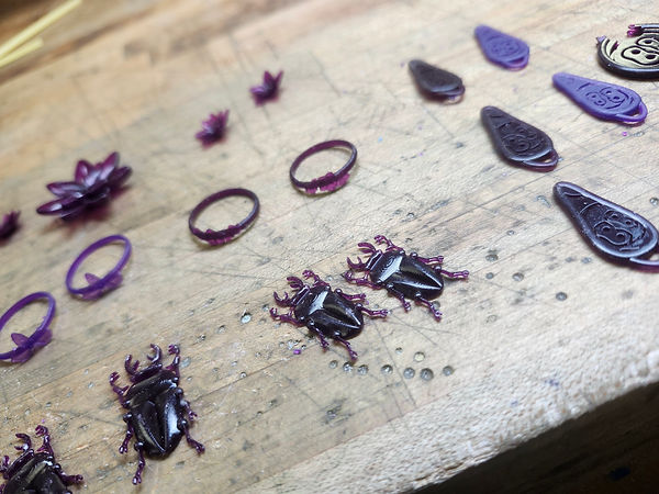 I created this design for the SCAD Jewelry Trunk Show with the intention of making a small, detailed piece that would work well commercially while still reflecting my artistic identity. I chose to model a stag beetle in Rhino as a simple stud earring, focusing on capturing its intricate form. Perfecting the spruing process was challenging, especially with the thin legs, but the effort was well worth it for the final result. I’ve made several variations of these earrings, but the ones pictured here are my favorite, finished in sterling silver with a liver sulfur patina to achieve a darker look that echoes the natural coloring of many stag beetles.